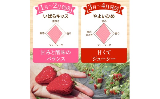 1~2月と3~4月は「いちご」酸味と甘みのバランスが良い茨城県の品種「いばらキッス」と、粒が大きめでジューシーで甘い「やよいひめ」。