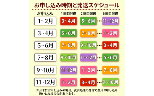 - 1~2月:いちご(いばらキッス) 4パック入り1箱 3~4月:いちご(やよいひめ) 4パック入り1箱 5~6月:イバラキングメロン 2玉 約2kg前後 7~8月:梨(幸水)3kg 3L~5L 6~8玉 9~10月:シャインマスカット&旬のふどう(各1房 計2房 約1kg以上)※旬のぶどうは、クインニーナ、Bkシードレスのどちらかになります。 11~12月:キウイ(約3kg)