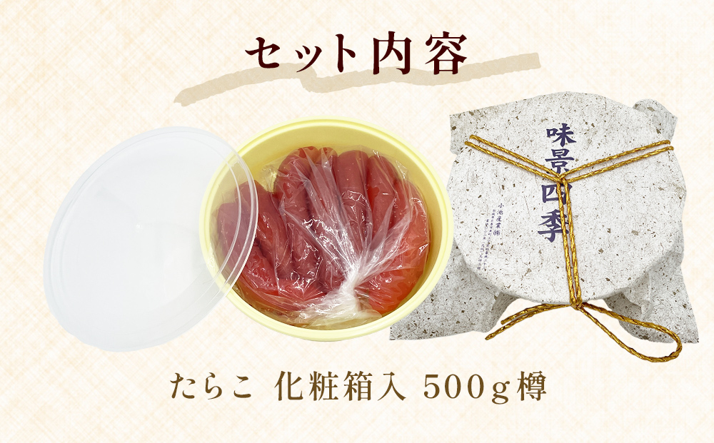 たらこ 500g樽詰め×1樽 【原材料】 スケトウダラの卵巣(アメリカ産又はロシア産)、食塩/調味料(アミノ酸等)、酸化防止剤(ビタミンC)、甘味料(甘草)、着色料(赤102、黄5)、発色剤(亜硝酸Na)