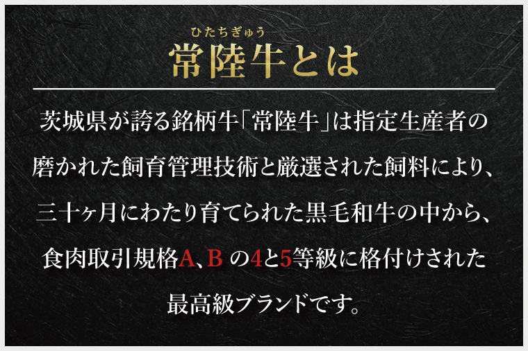 指定生産者が茨城県内で、30ヶ月にわたり育てられた黒毛和牛の中から、食肉取引規格A、Bの4と5等級に格付けされたものだけが常陸牛として流通できる最高級ブランドです。