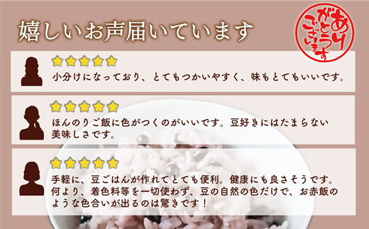 黒千石の豆ごはんは、何と言っても豆が極小粒のため、お米ととても相性が良く、また、真っ黒な果皮に多く含むポリフェノールの色素が水に溶けだし、炊きあがったお米は綺麗な薄紫色になり、食卓を華やかにしてくれます。ほのかな豆の甘みを感じられ、プチプチ食感で満足感もあり、一緒に食べる様々なおかずの邪魔をしません!