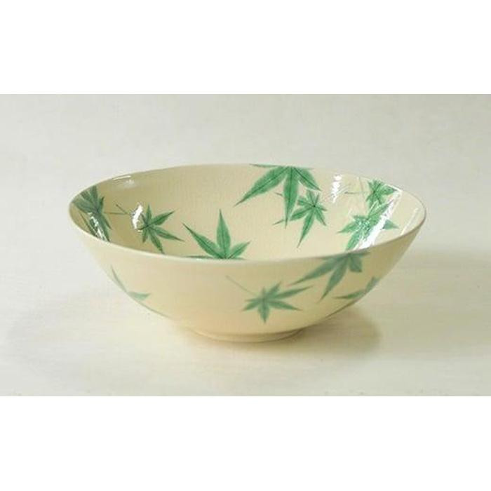 赤く色づく前の青々とした若葉の楓(かえで)の葉をモチーフに、初夏の爽やかさや清々しさを当窯の絵付け師が一つひとつ手描きで表現しています。