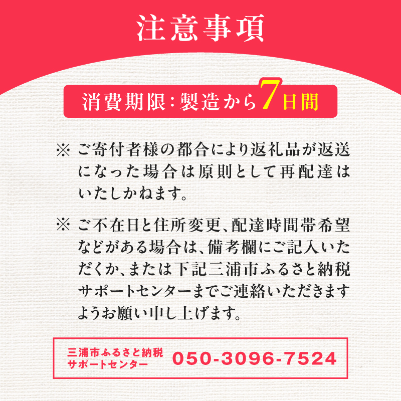 ※ご不在日と住所変更、配達時間帯希望などがある場合は、備考欄にご記入いただくか、または下記三浦市ふるさと納税サポートセンターまでご連絡いただきますようお願い申し上げます。