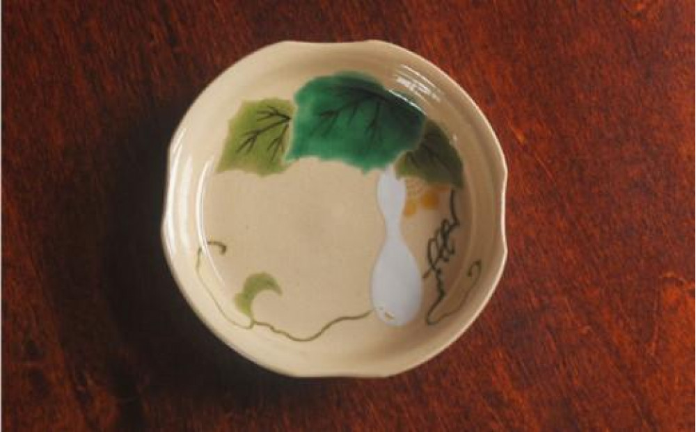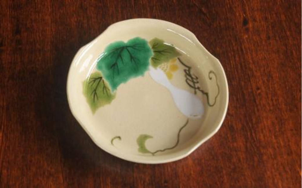本品では、茂った葉の陰から見える瓢箪(ひょうたん)と、黄色い瓢箪の花の愛らしさを当窯の絵付け師が手描きで表現しています。