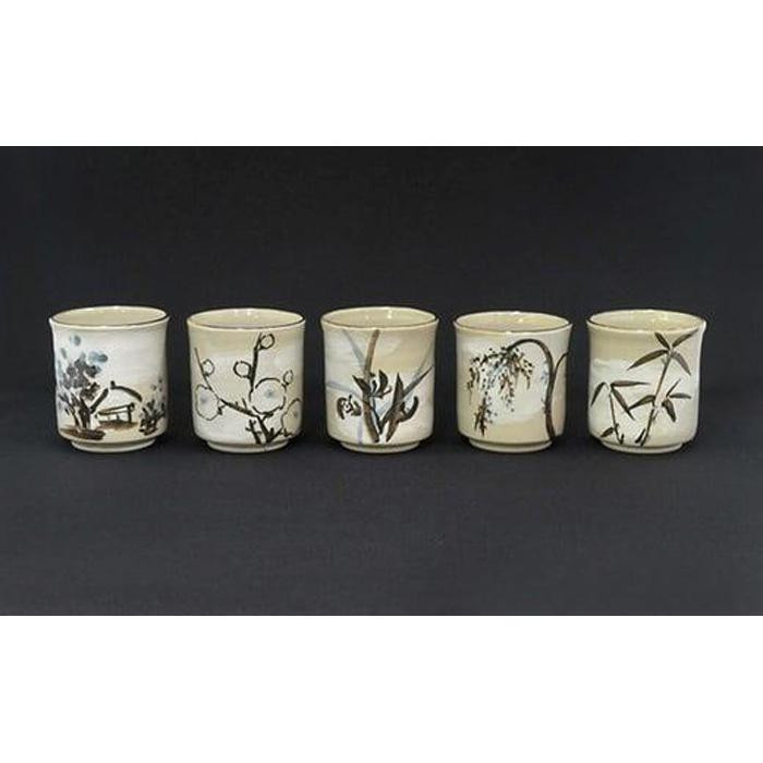 当窯の絵付け師が一つひとつ手描きした、梅・蘭・柳・竹・山水の5つの絵柄のお湯呑みは、毎日の食卓に、上品な華やかさを加えます。
