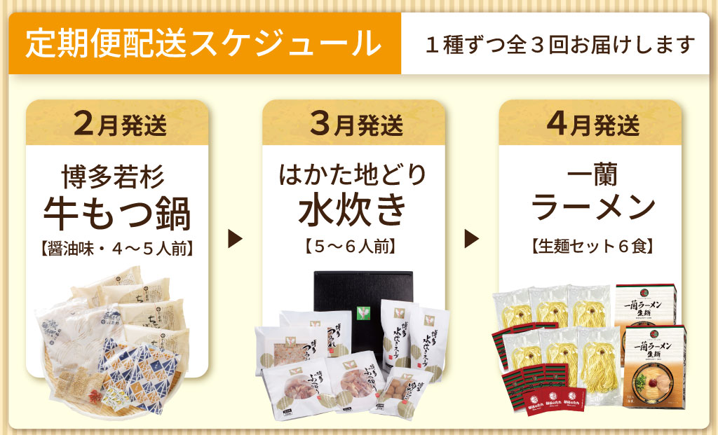 2月は「博多若杉」の国産牛もつ鍋、3月は旨みが濃いはかた地どりを使用した本格水炊き、4月は名店「一蘭」の生麺ラーメンをご用意しました。