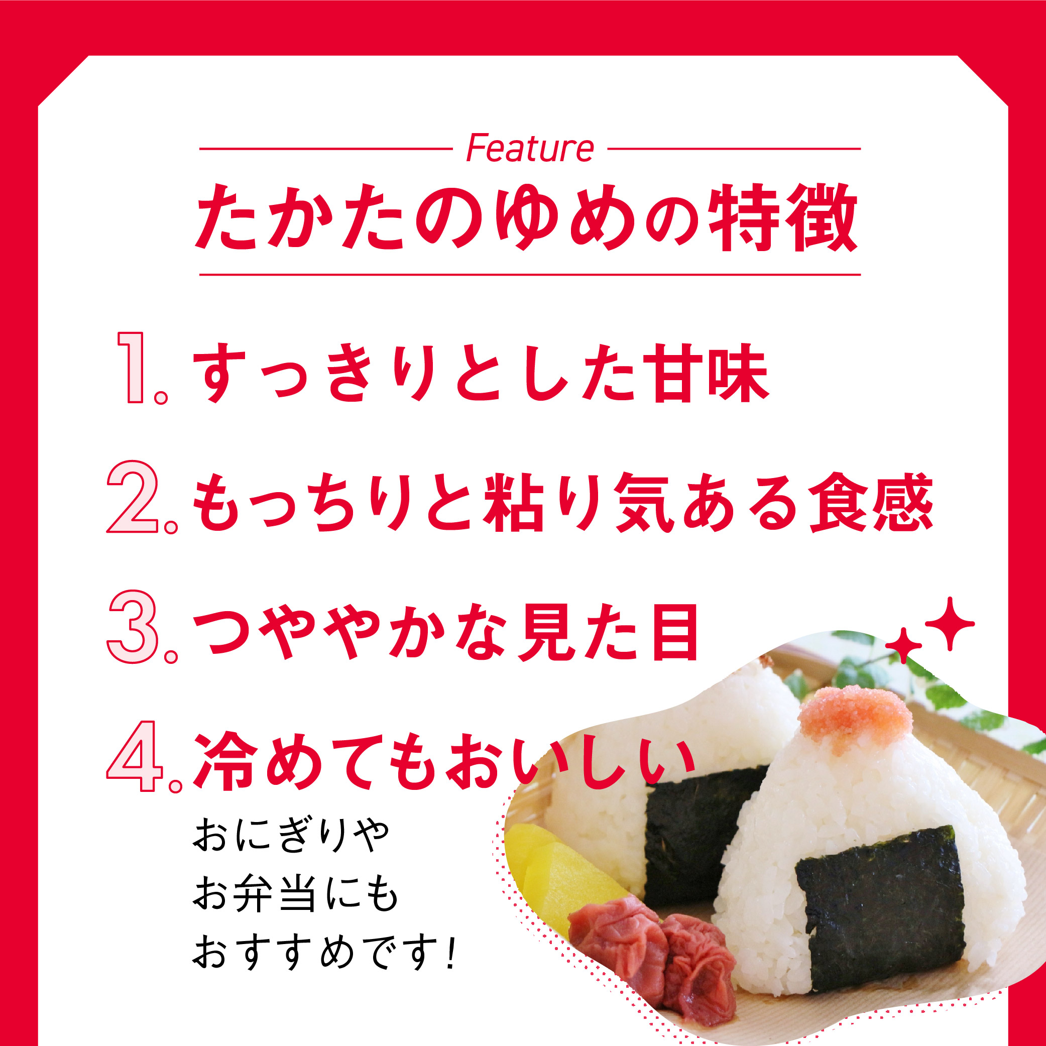 つややかな見た目とすっきりとした甘味、もっちりとした粘り気のある食感が特長です。さらに、冷めてもおいしく時間をおいてから食べるお弁当やおにぎりなどにも適したお米です。