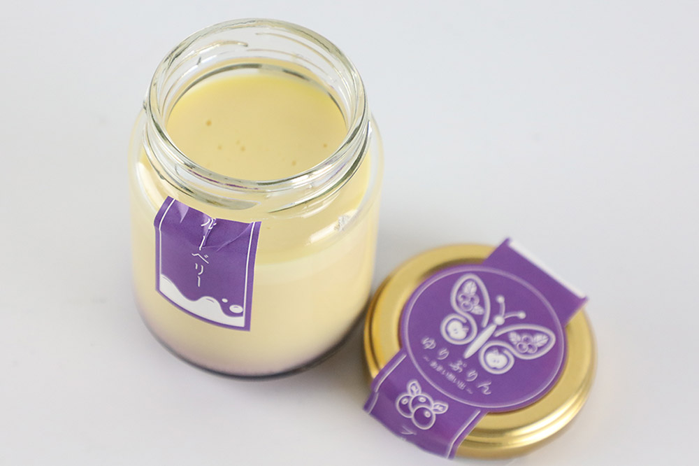 由利高校が女子高校だった当時に制服のボタンにデザインされていた「蝶々」をモチーフとし、プリンに使われている由利本荘市産食材の「りんご」と「ブルーベリー」羽にをあしらった、地元「ゆり」を表現したデザインです。
