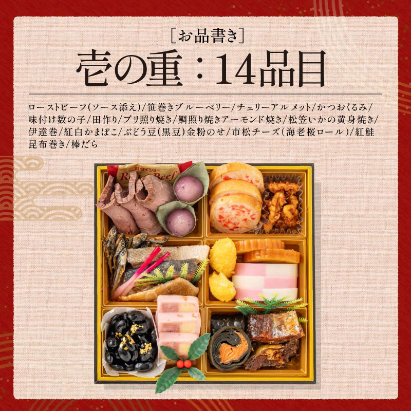 ローストビーフ(ソース添え)、笹巻きブルーベリー、チェリーアルメット、かつおくるみ、田作り、ブリ照り焼き、鯛照り焼きアーモンド焼き、はじかみ、松笠いかの黄身焼き、伊達巻、紅白かまぼこ、ぶどう豆(黒豆)金粉のせ、市松チーズ(海老桜ロール)、紅鮭昆布巻き、棒だら