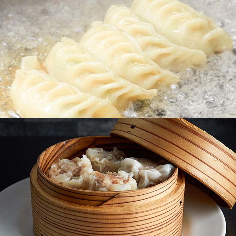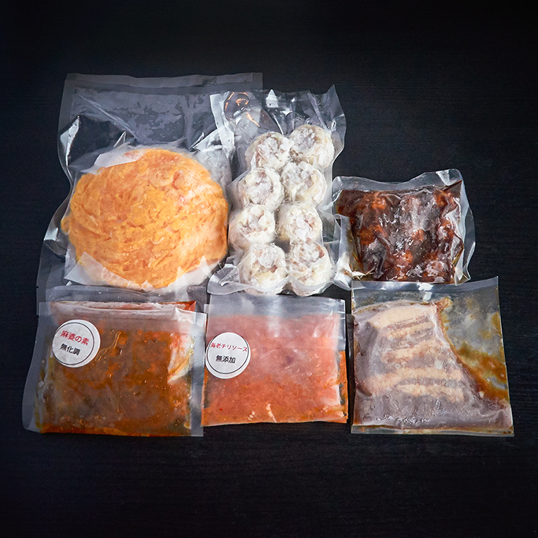 (1)ゆず餃子12個入 (2)生餃子12個入 (3)焼売8個入 (4)エビチリ1人前 (5)豚角煮2枚入 (6)四川風マーボーの素約2人前 (7)甘口マーボーの素2約人前 (8)肉団子黒酢ソース8個入り (9)天津飯の素2人前 各1個