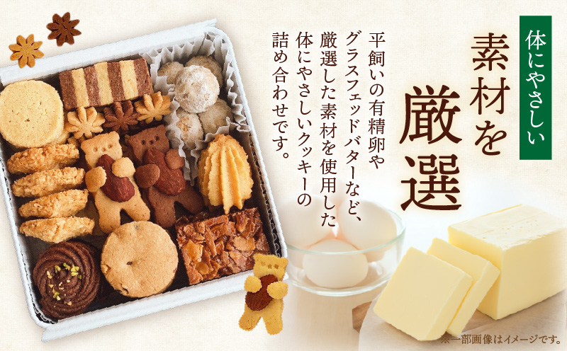 平飼いの有精卵やグラスフェッドバターなど、厳選した素材を使用した体にやさしいクッキーの詰め合わせです。