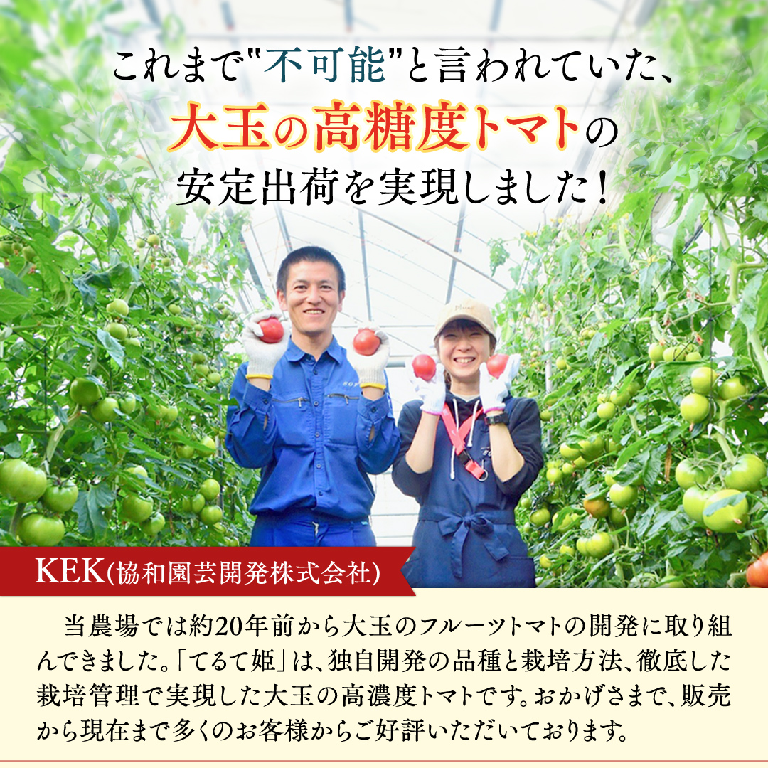 抗酸化作用が強く、免疫力向上効果が期待されるリコピンが通常のトマトの約2倍含まれております。リコピンは美容効果も期待されているため、健康にもお肌にも良いおいしいトマトです。