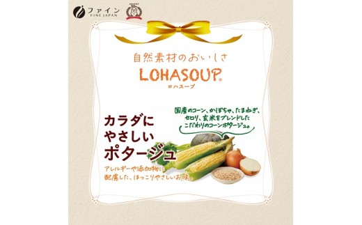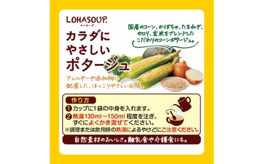 ●4種の国産野菜(コーン、かぼちゃ、たまねぎ、セロリ)を使用し、玄米をブレンドしたほっこりやさしいお味のコーンポタージュ。