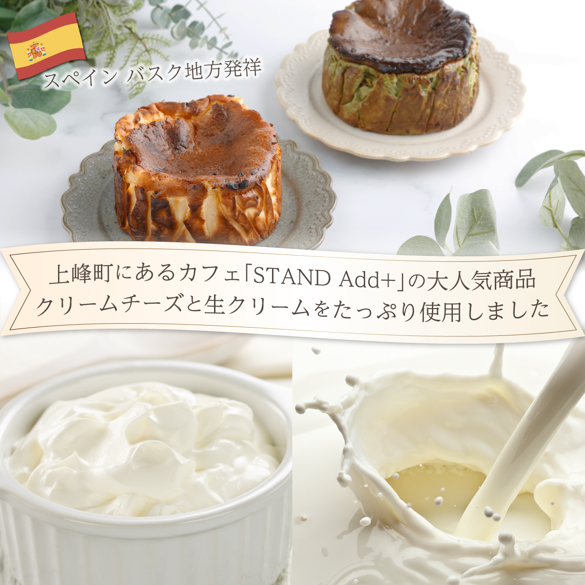 間違いなしの美味しさの「プレーン」と、ちょっぴりビターな「抹茶」からお好きな組み合わせを選べる、贅沢なバスクチーズケーキセットです。