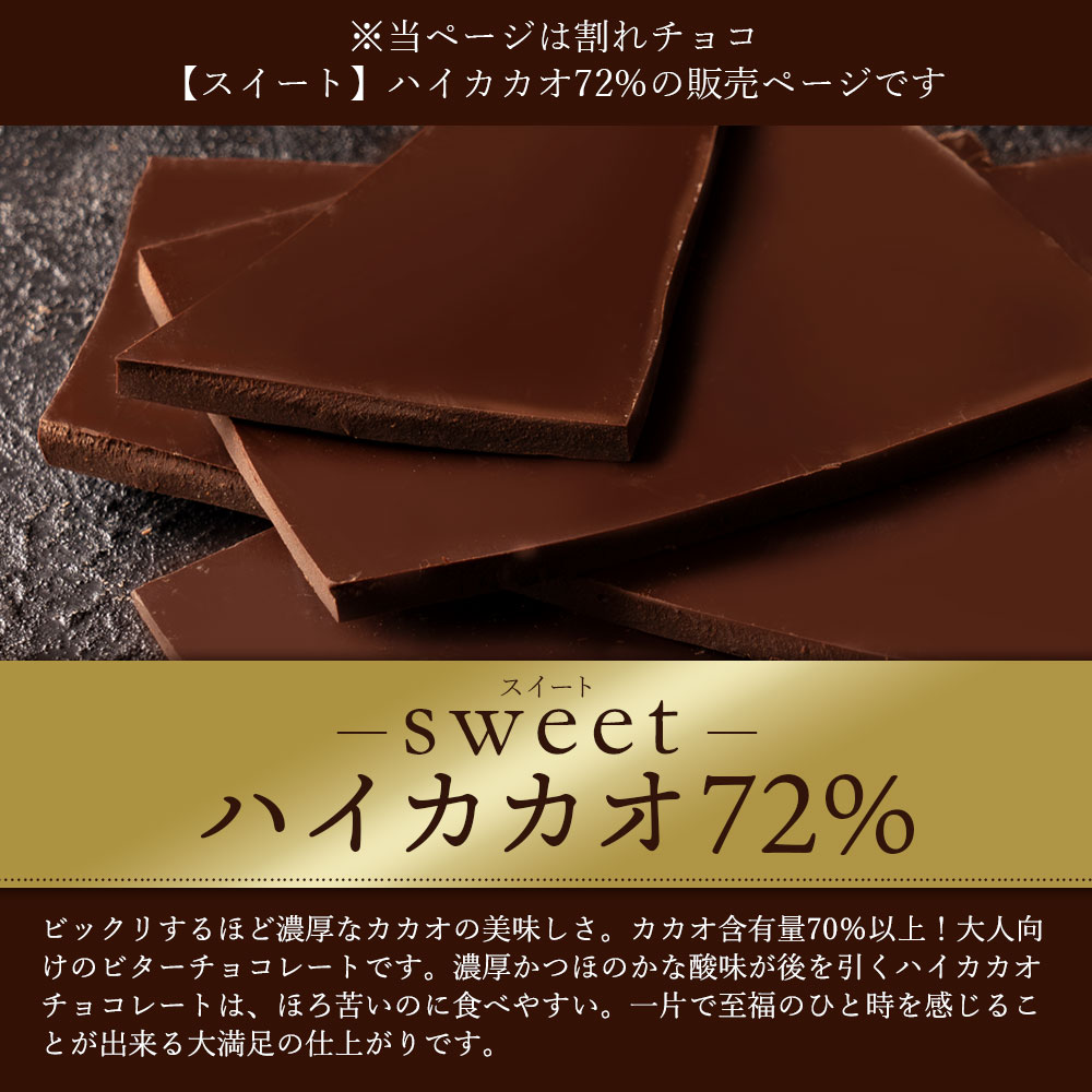ビックリするほど濃厚なカカオの美味しさ。カカオ含有量70%以上!大人向 けのビターチョコレートです。濃厚かつほのかな酸味が後を引くハイカカオ チョコレートは、ほろ苦いのに食べやすい。一片で至福のひと時を感じるこ とが出来る大満足の仕上がりです。