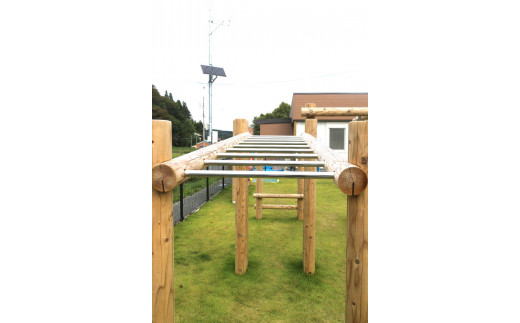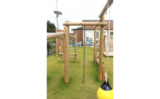内容:角度付うんてい、鉄棒、登り棒、丸太登り、吊りボールの複合遊具です。