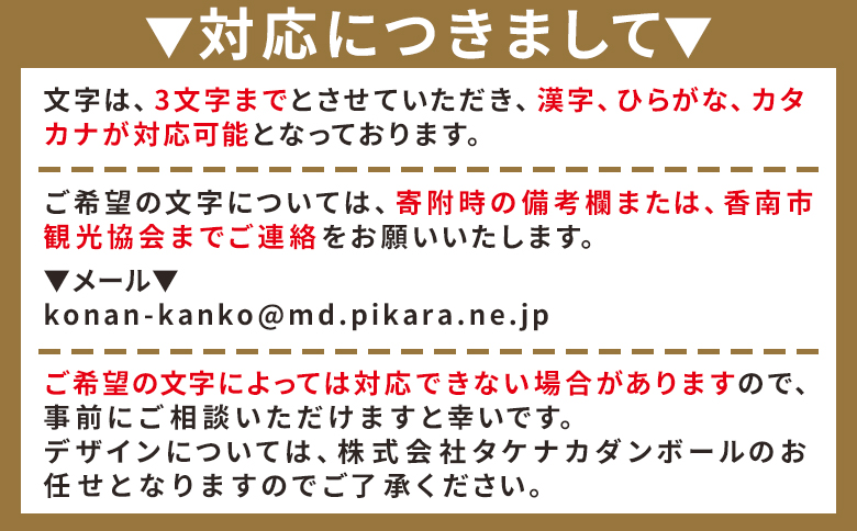 ご希望の文字については、寄附時の備考欄または、香南市観光協会までメール(konan-kanko@md.pikara.ne.jp)にてご連絡をお願いいたします。