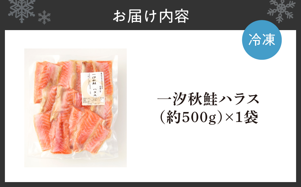 秋鮭のハラスだけを使い、塩だけで味を整えました。魚本来の味が楽しめる逸品になっております。フライパン、グリル等で加熱してお召し上がり下さい。