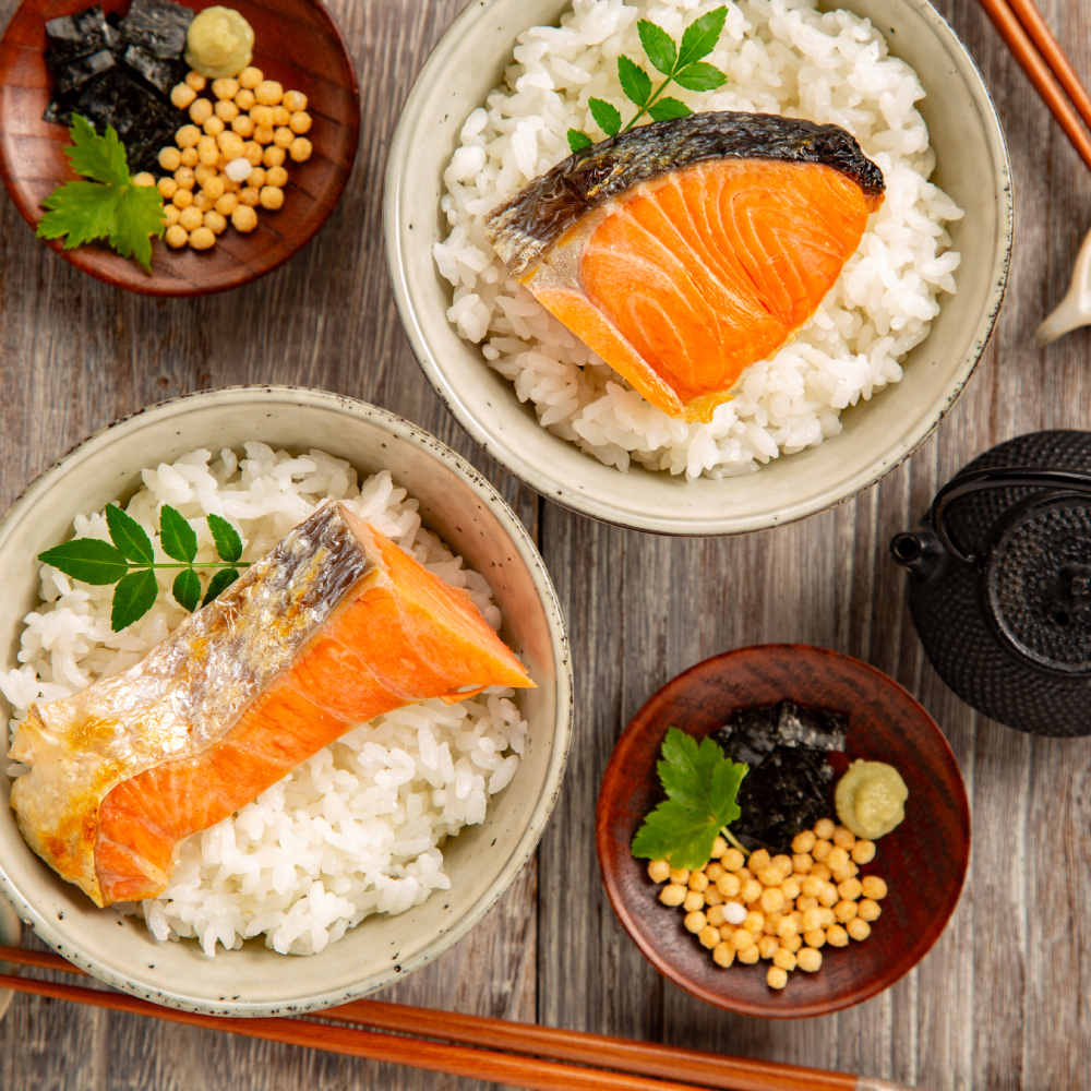 あつあつの白飯に焼いてほぐした紅鮭と、その上にいくら醤油漬を掛けた親子丼で食べるのがオススメです!
