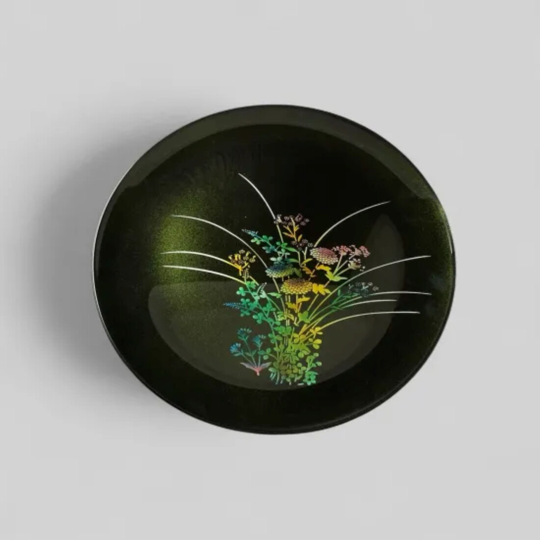 ガラスの裏面から特殊漆を意匠付けし、特殊食器洗浄機対応コートで漆をカバーしている漆器です。