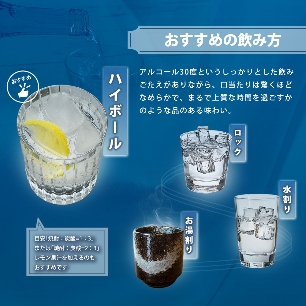 ハイボールでもおすすめです。目安は焼酎:炭酸=1:3。レモン果汁を加えるのもおすすめです。