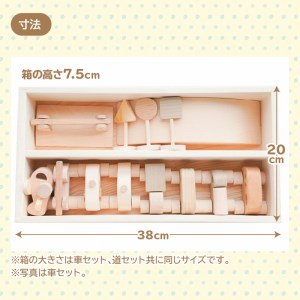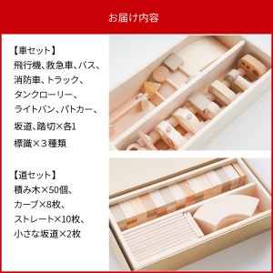 飛行機、救急車、バス、消防車、トラック、タンクローリー車、ライトバン、パトカー、車は8台。坂道、踏み切り、標識3点が入っています。道セットと組み合わせて自分の道路を作りましょう。