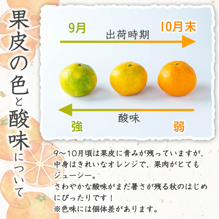 ※出荷当初はみかんの皮の一部または全部が緑色です。日が経つにつれて黄色に変わっていきます。それに合わせて徐々に酸味が抜けていきます。見た目と味の変化も楽しみながら、お好みの味を探してみるのも一興。