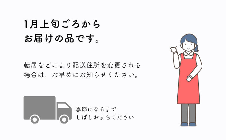 ※その年の気候により変動がございますので、配送時期は目安となります。到着日の指定はできませんのでご了承ください。