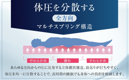 中材に特殊技術「アクアゴールドシリカ」を配合したポリエチレン素材のファイバーを使用。ファイバーの1本1本がしっかりと絡み合う特性を利用し、立体成型したことにより通気性と保温性を確保。寝返りをサポートするため、カラダの部位に応じて中材の密度と硬さに変化を持たせました。