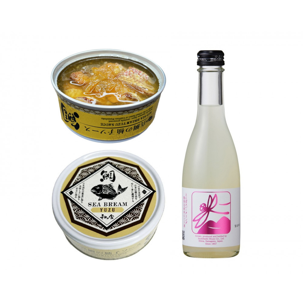 本製品は、国産素材にこだわり【愛媛県産の真鯛】と【高知県、愛媛県産の柚子】を使って作った【真鯛の柚子ソース缶詰】と【とんぼスパークリング】のセットになります。