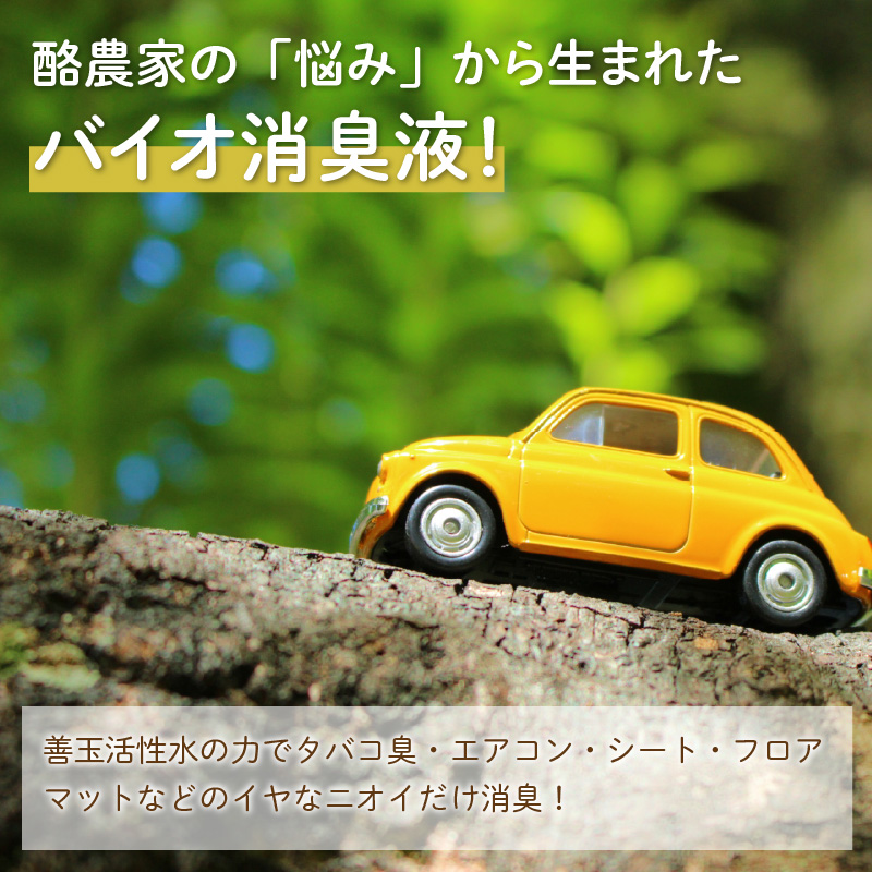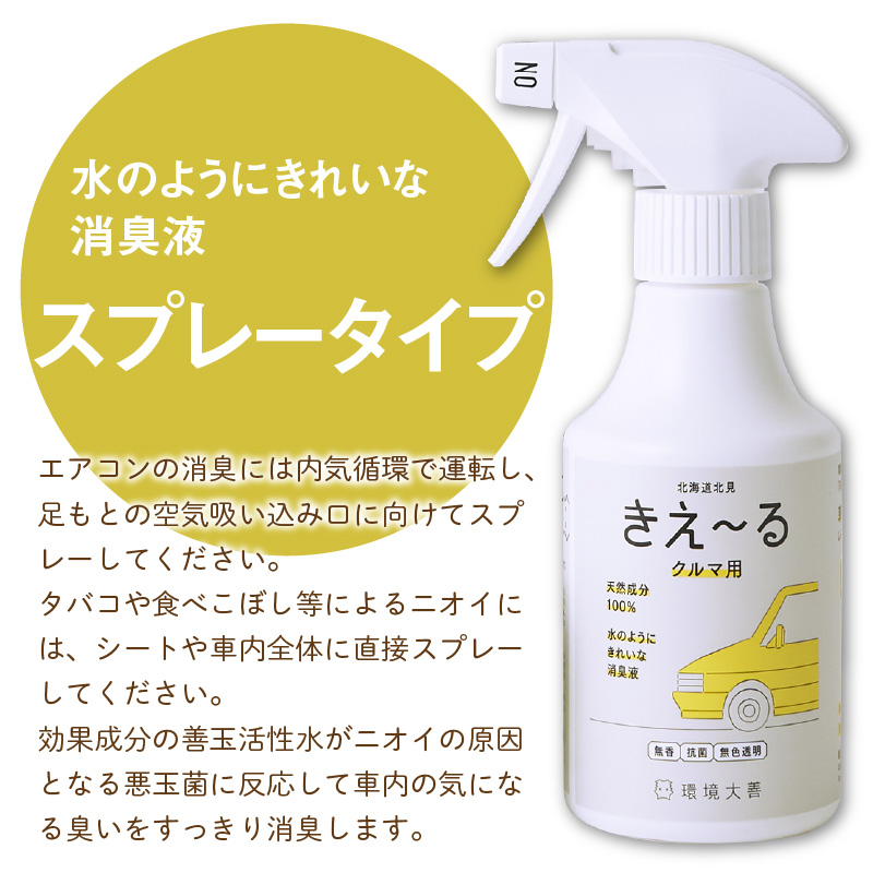 善玉活性水の力でタバコ臭・エアコン・シート・フロアマットなどのイヤなニオイだけ消臭!