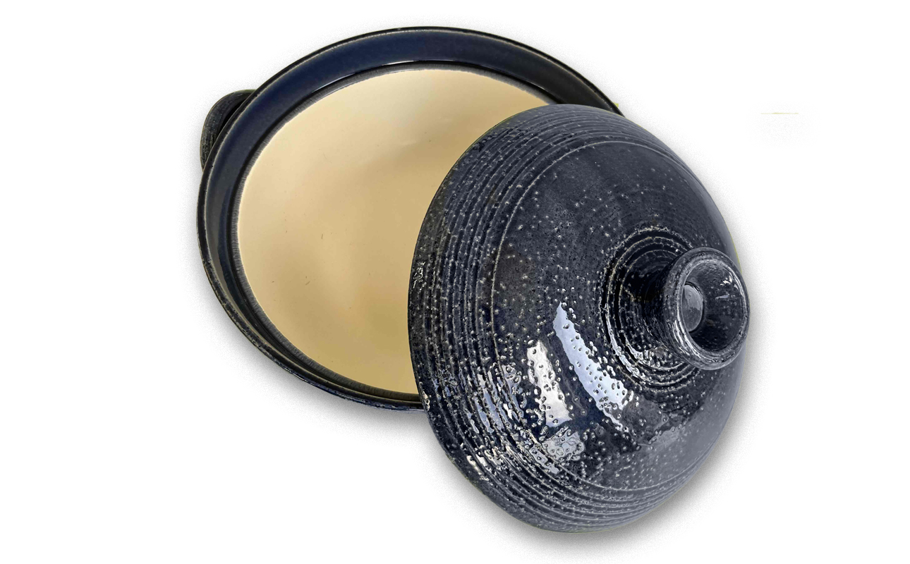 吹きこぼれしにくい土鍋。縁が高く、外に広がり、吹きこぼれしにくい形状になっており、おでん等、具材をたくさん入れる料理に適しています。