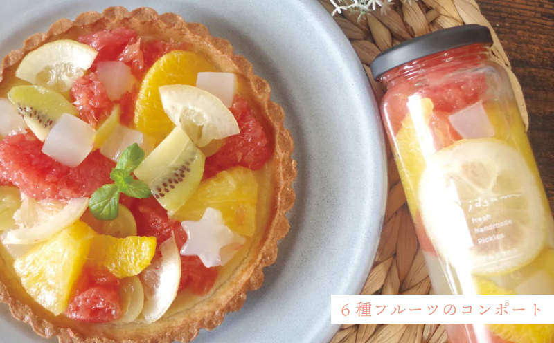 水なすピクルス和風mix(細瓶)、うずら卵のピクルス(ピュアモルトフレーバー)(細瓶)、6種のコンポート、アロマドレッシング(オレンジ&ジンジャー&にんじん)、アロマドレッシング(ゆず&山椒&シロミソ)各1本 ギフト箱に入れてお届け