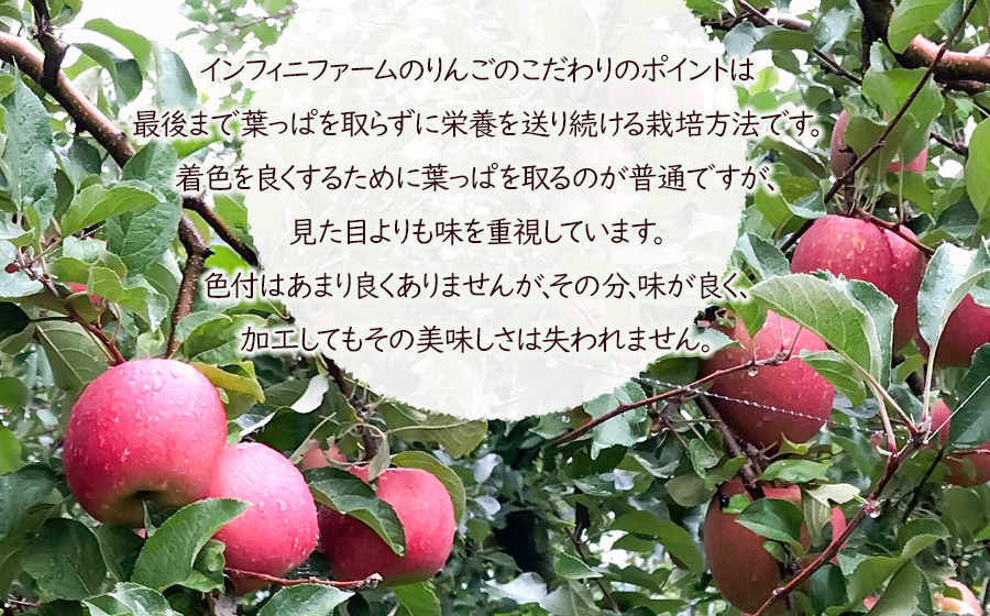 インフィニファームのりんごのこだわりのポイントは最後まで葉っぱを取らずに栄養を送り続ける栽培方法です。