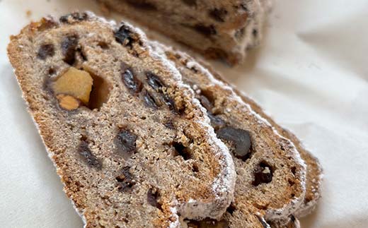 りんご・レーズン・クランベリー・アプリコット・くるみ・アーモンド・オレンジピールが詰まっており、甘さ控えめながらも深みのある味わいに仕上がっています。