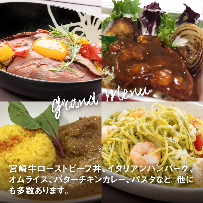 宮崎牛ローストビーフ丼、イタリアンハンバーグ、オムライス、バターチキンカレー、パスタなど。他にも多数あります。