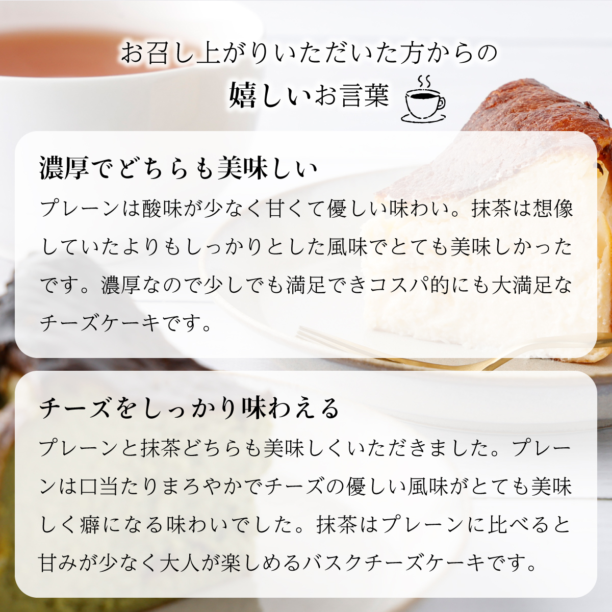 間違いなしの美味しさの「プレーン」と、ちょっぴりビターな「抹茶」からお好きな組み合わせを選べる、贅沢なバスクチーズケーキセットです。