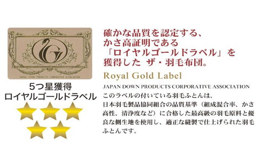 こちらのページでお申し込みできる「ザ・羽毛布団」は、5つ星獲得の「ロイヤルゴールドラベル」認定です。
