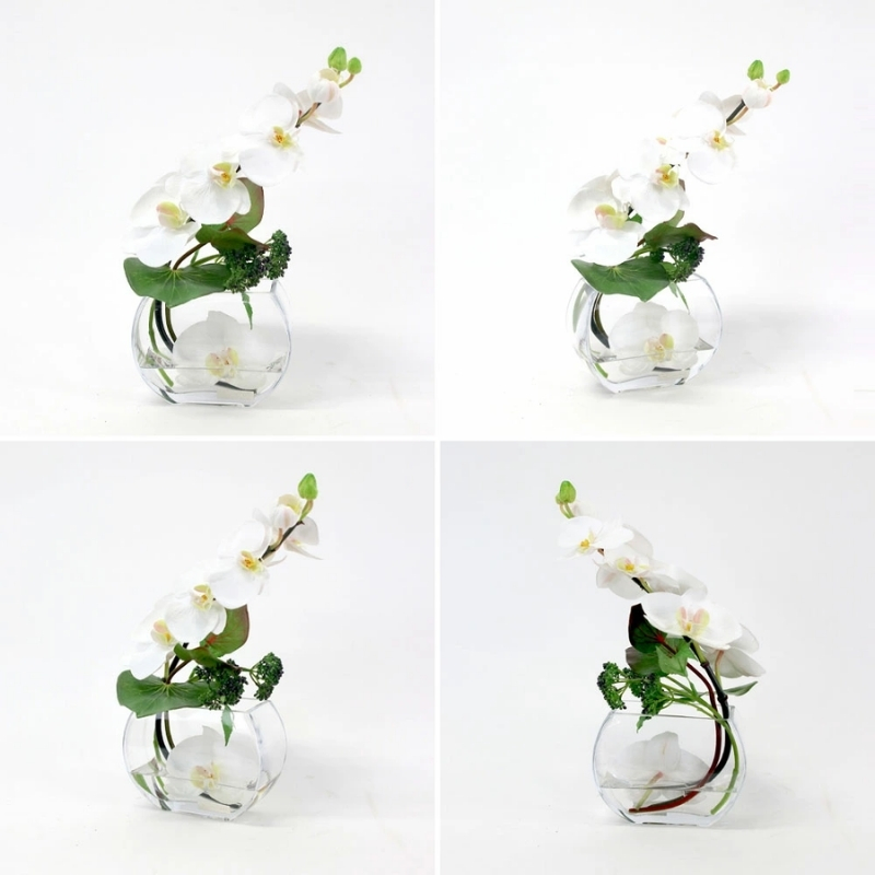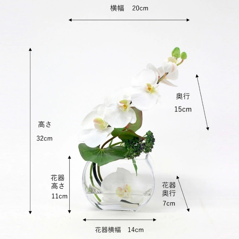 ファレノプシスの柔らかなラインと、フラワーベースの丸みがマッチしたナチュラルモダンなアレンジメントです。