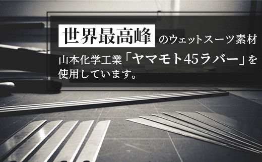 当店では世界最高峰のウエットスーツ素材と知られている山本化学工業のヤマモト45ラバーを使用しています。この素材は、高い伸縮性と保温性を備え、水中での快適さとパフォーマンスを向上させます。