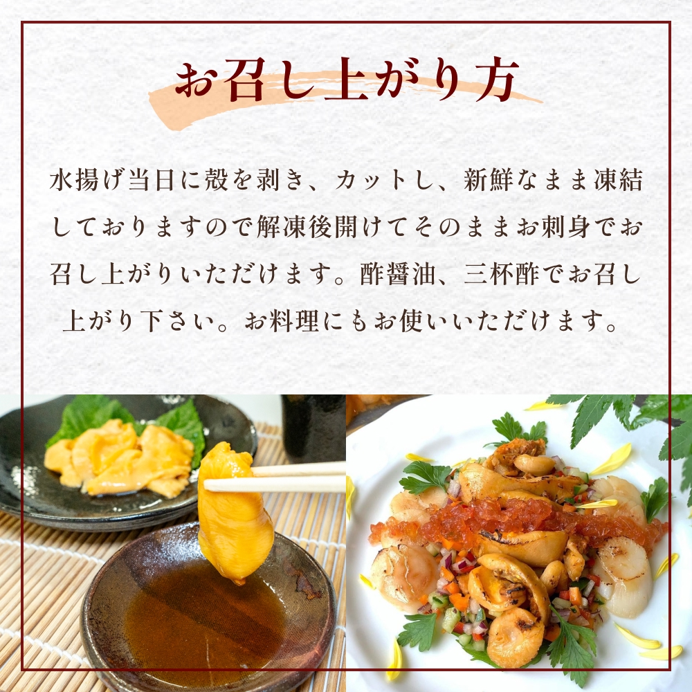 水揚げ当日に殻を剥き、カットし、新鮮なまま凍結しておりますので解凍後開けてそのままお刺身でお召し上がりいただけます。酢醤油、三杯酢でお召し上がり下さい。お料理にもお使いいただけます。