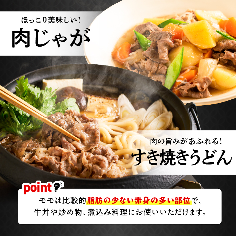 モモは比較的脂肪の少ない赤身の多い部位で、牛丼や炒め物、煮込み料理にお使いいただけます。