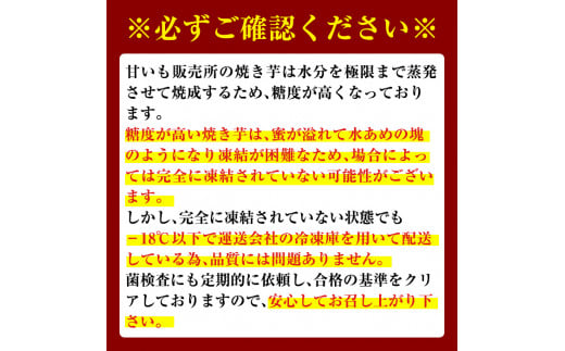 糖度が高い焼き芋は、蜜が溢れて水あめの塊のようになり凍結が困難な為、場合によっては完全に凍結されていない可能性がございます。