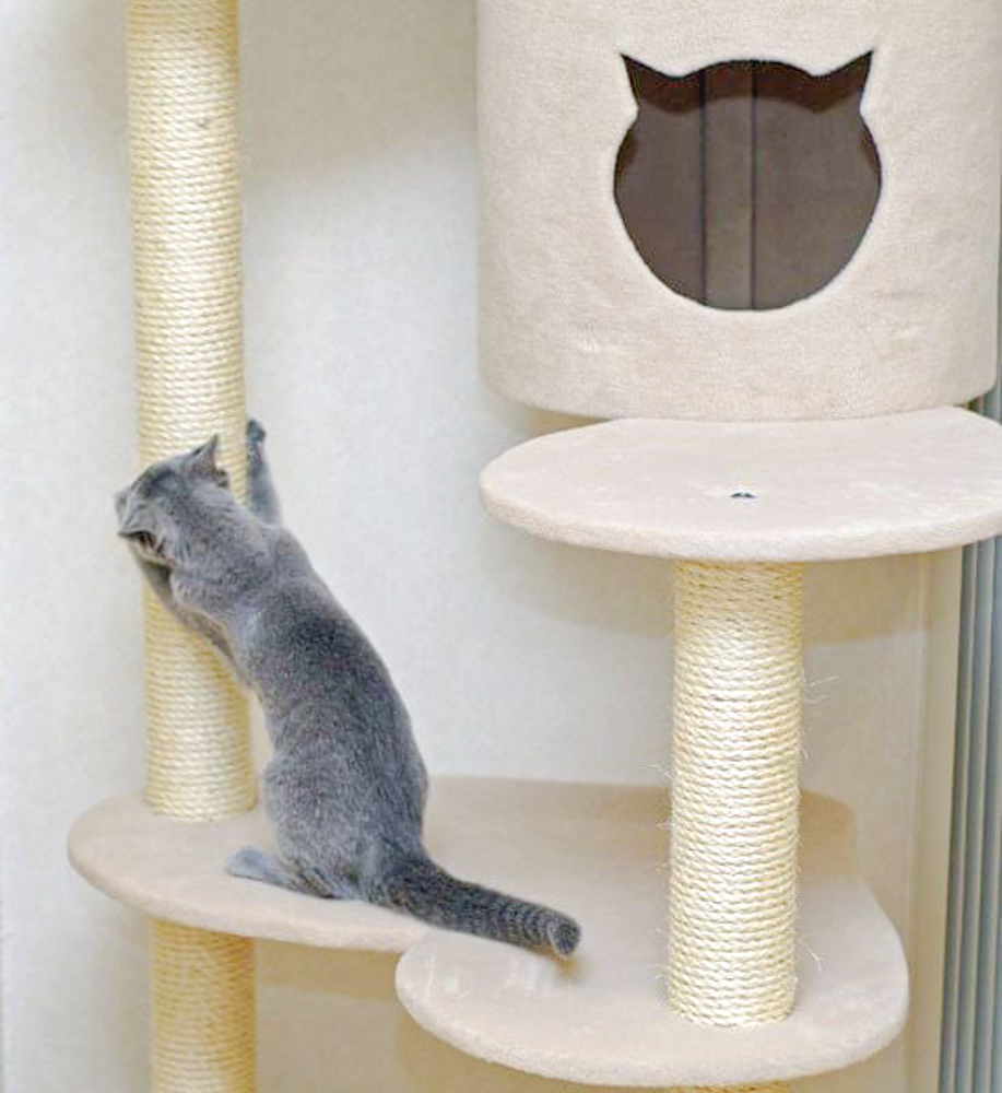 ステップ台には、静電気が起きにくい加工が施されているフリースを使用。ネイルケアのポールは麻縄を使用しております。