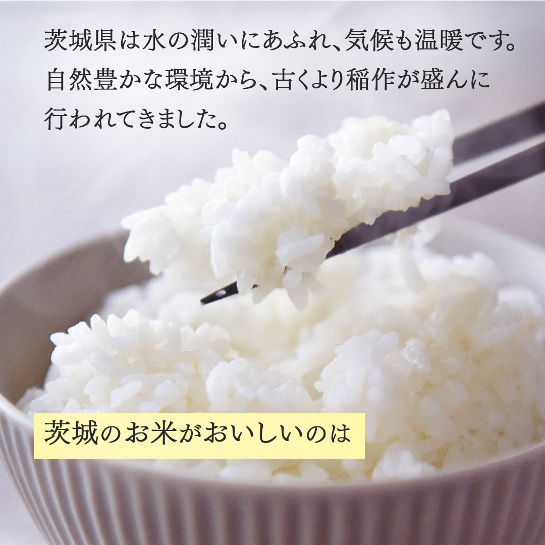 茨城県は久慈川、那珂川、小貝川、鬼怒川、利根川などの水の潤いにあふれ、気候も温暖です。自然豊かな環境から、古くより稲作が盛んに行われてきました。茨城のお米がおいしいのは、育ち盛りの稲にたっぷりの水分を与える6月の豊富な降水量、実り豊かにする7・8月の晴天率の高さ、稲穂の水分を調整する9月の乾燥した空気など、自然豊かな気候が米の栽培に適しているためです。