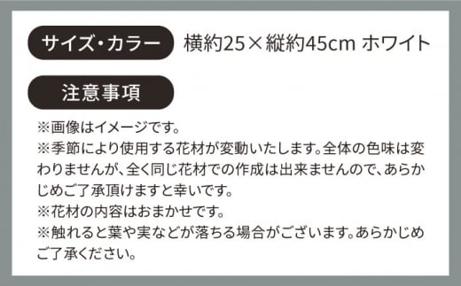 ・季節によって使用する花材は多少異なる場合もございます。全体の色味は変わりませんが、全く同じ花材での作成は出来ませんので、あらかじめご了承いただけますと幸いです。
