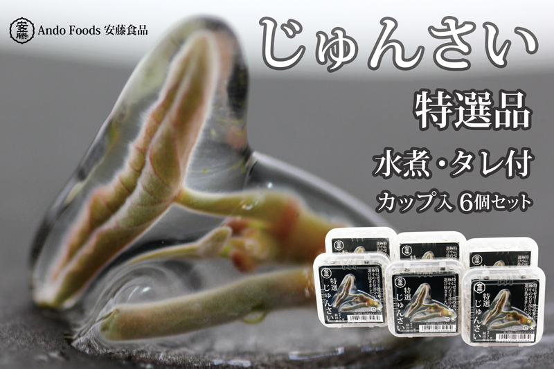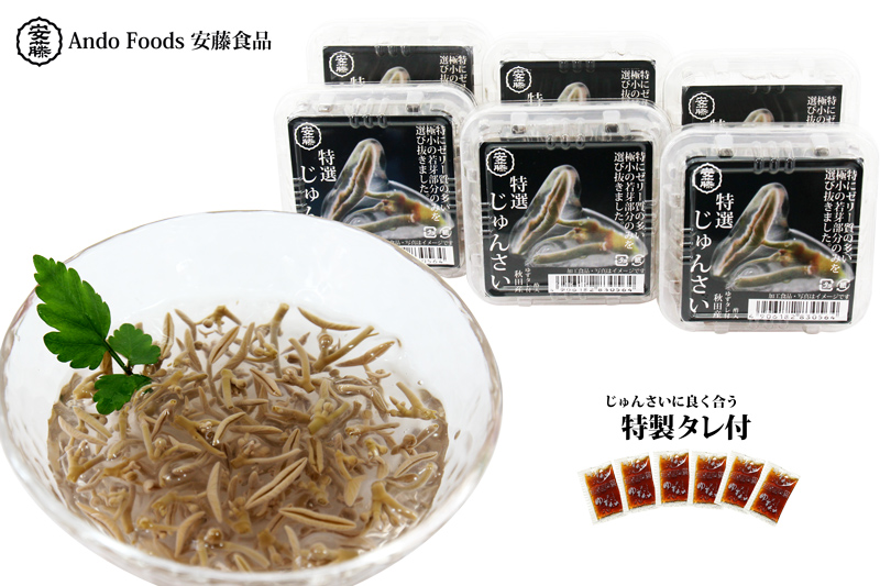 今まさに大きくなろうとしているじゅんさいの極小の若芽部分はたっぷりのゼリー質に覆われていて柔らかく抜群の食感です。この極小の若芽部分のみを選び抜いたものが特撰品です。一つ一つカット・選別し、極小の若芽の部分だけを選び抜く作業は大変な手間がかかりますが、その一手間一手間が抜群の食感を生み出します。