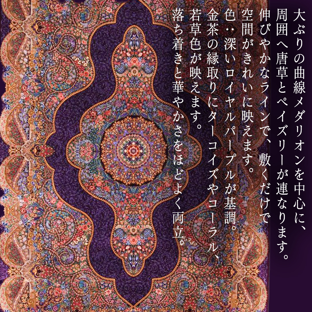 色:深いロイヤルパープルが基調。金茶の縁取りにターコイズやコーラル、若草色が映えます。