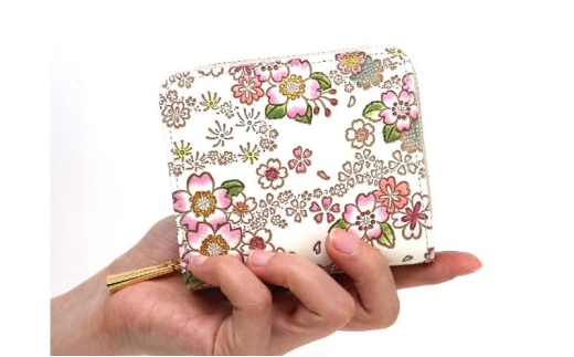 【文庫屋大関】二つ折りファスナーミニ財布 かすみ桜【皮革工芸品】財布 二つ折り 小物 お札 カード 小銭 コンパクト 牛革 手作り 日本製 墨田区 東京都 [№5619-2024]
