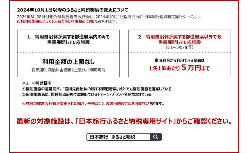 ■総務省告示第二百三号を受け、2024年10月1日以降の発行分より、寄附自治体が属する都道府県以外にも営業展開している施設(チェーンホテル等)に宿泊の場合、クーポンを利用できる金額は1人1泊5万円までとなります。(5万円を超える差額は、現金やクレジットカード等でお支払いとなります。)弊社店舗にて都度判断させていただきます。